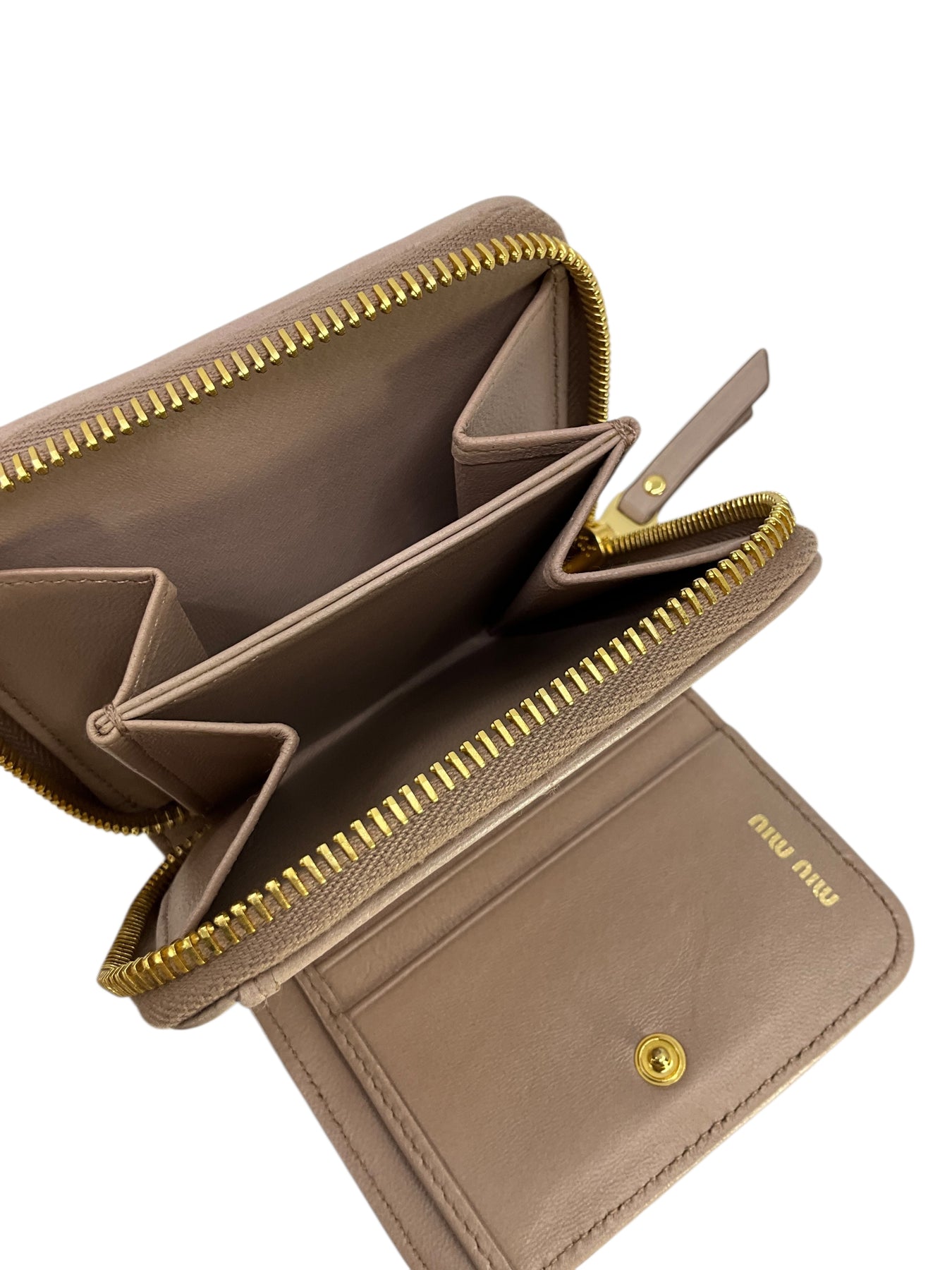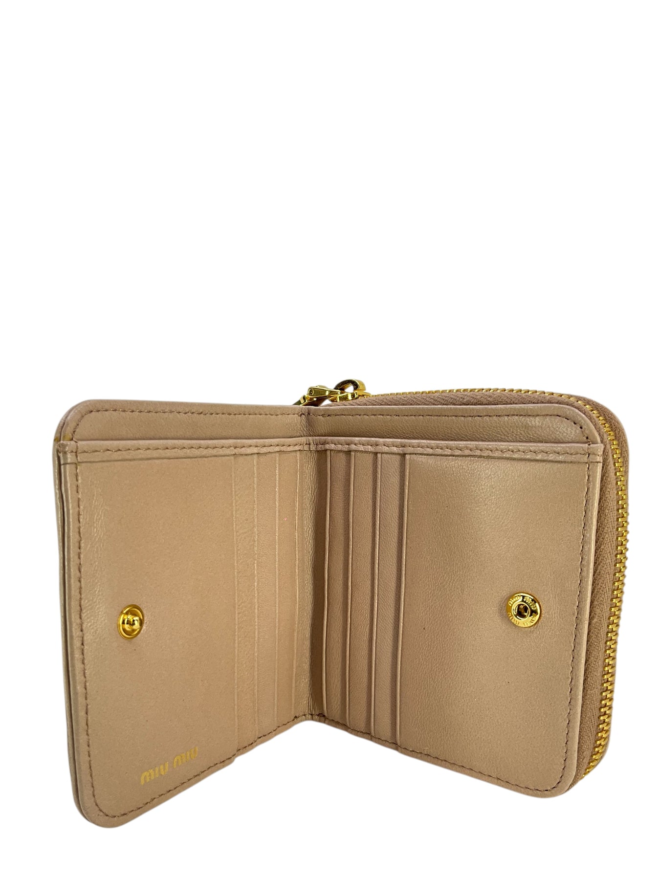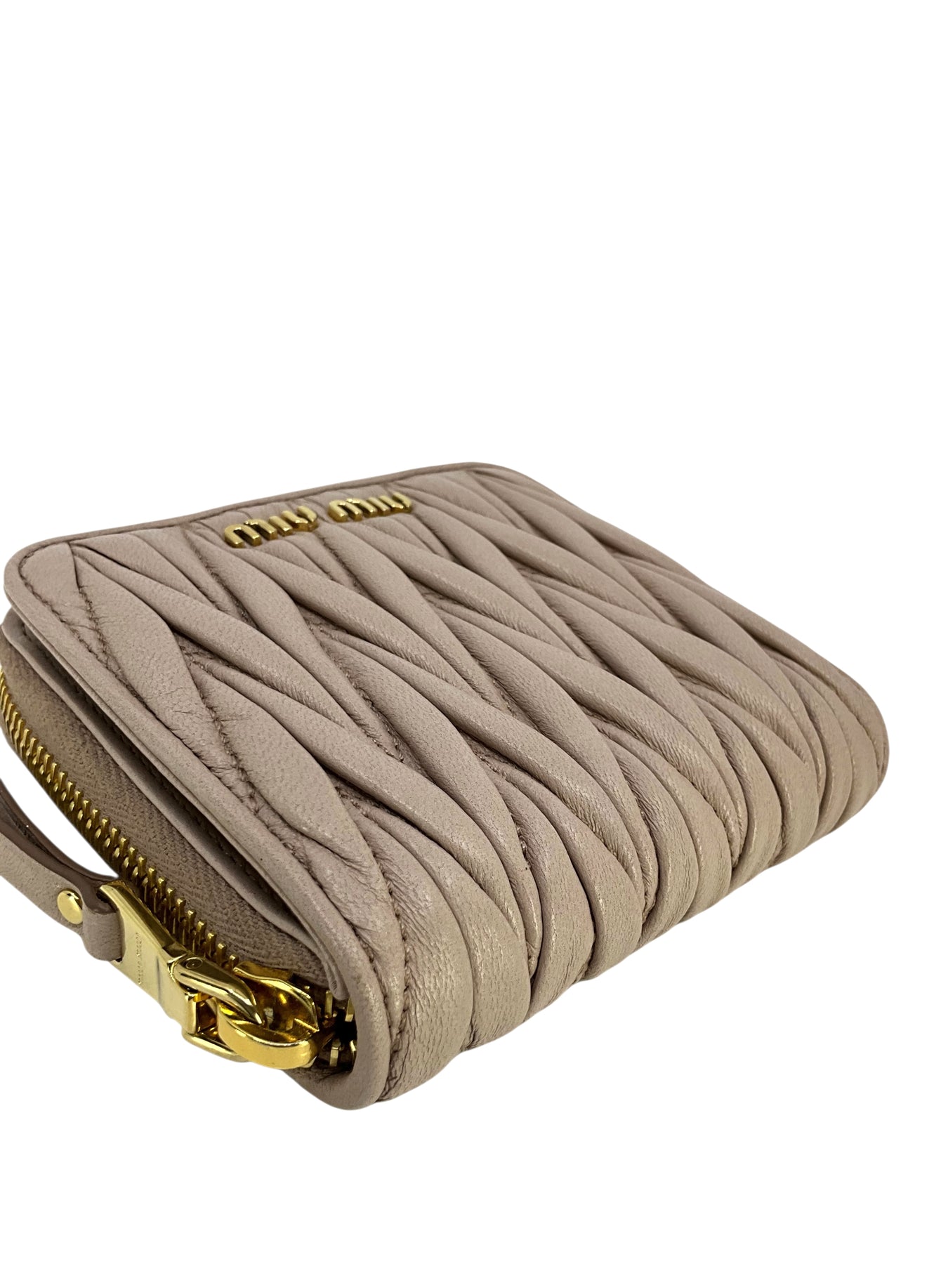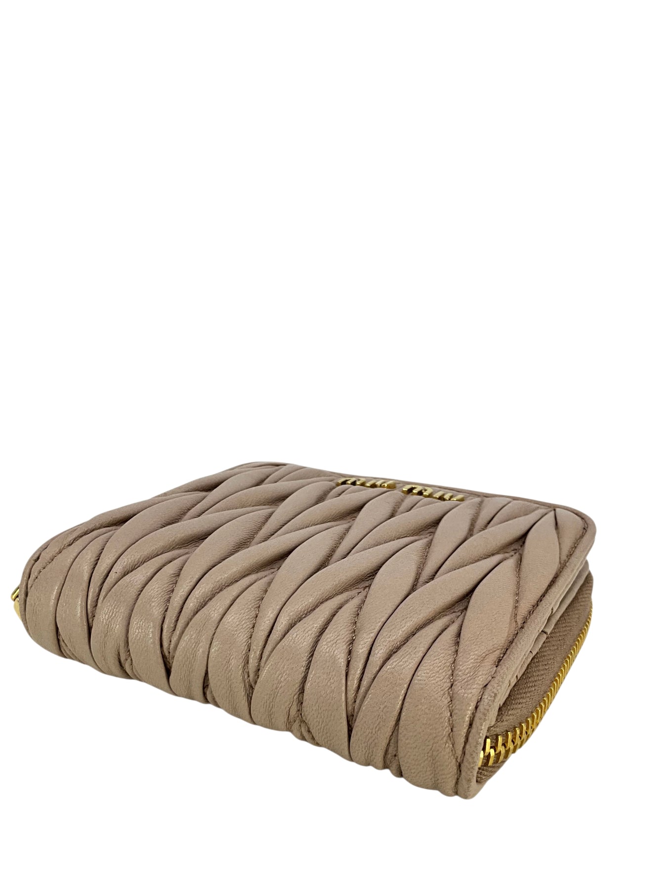 We guarantee the authenticity of this Miu Miu Matelasse Nappa Leather Small Wallet in taupe with a signature gold-tone logo front, a zip-around coin pouch and a secure snap closure.