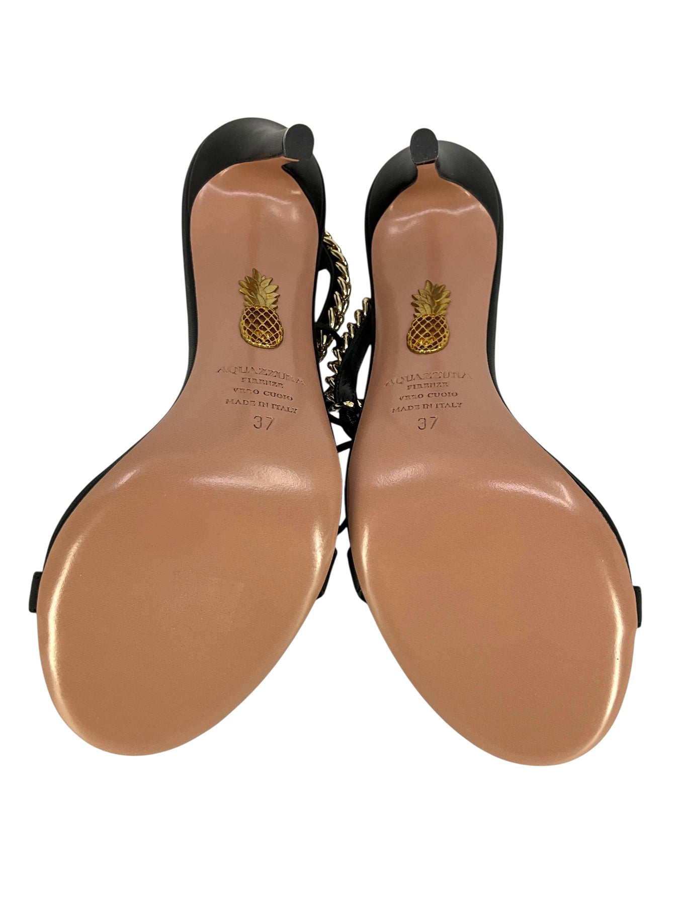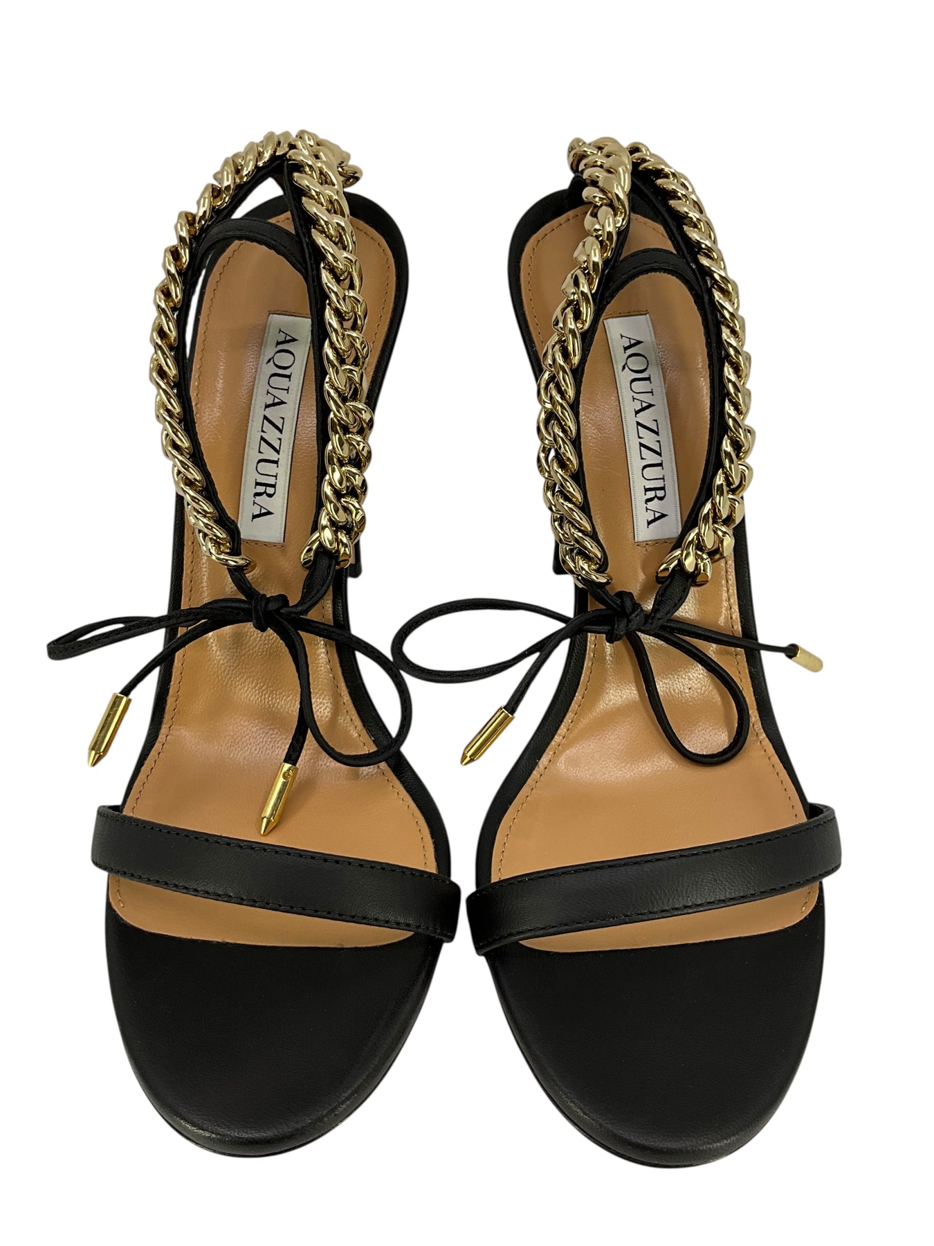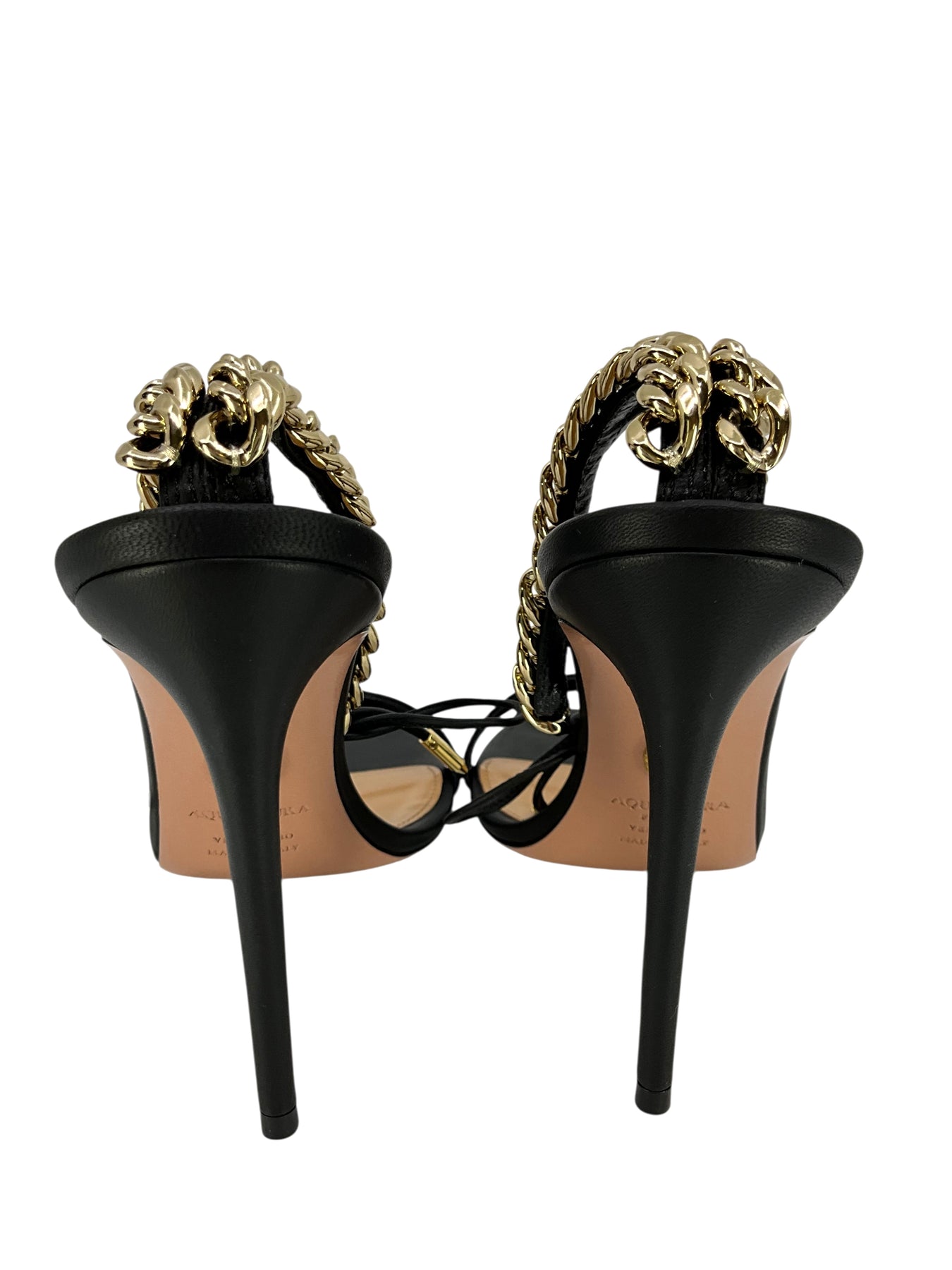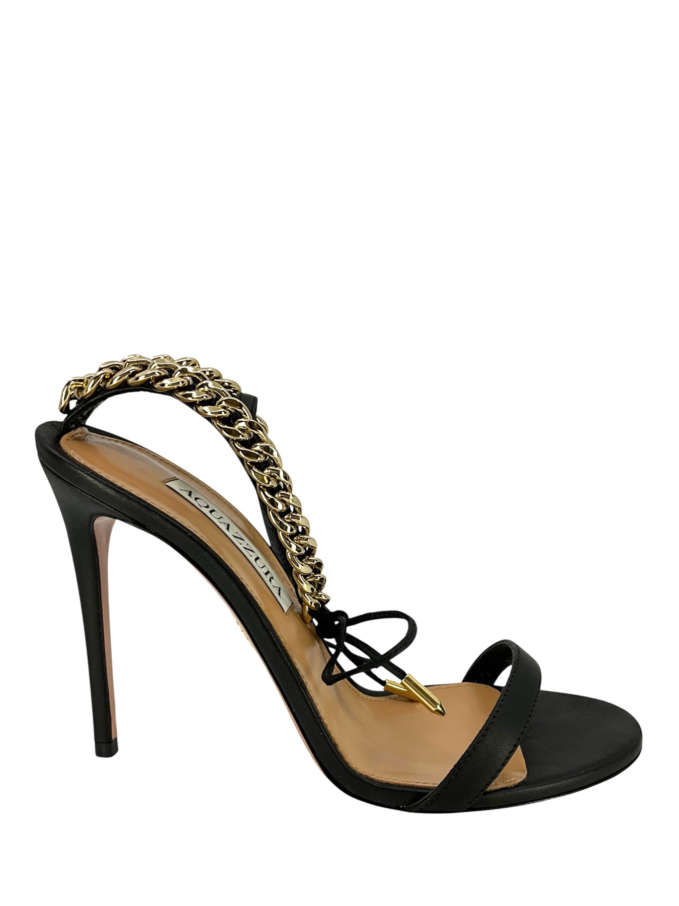 This is a never before used guaranteed authentic pair of AQUAZZURA Nikki 105 Sandals Size 7 NEW beautifully crafted supple black leather with an round open toe. Featuring gold-tone chain-link detailing, a tie-fastening ankle strap and a self-covered stiletto heel.