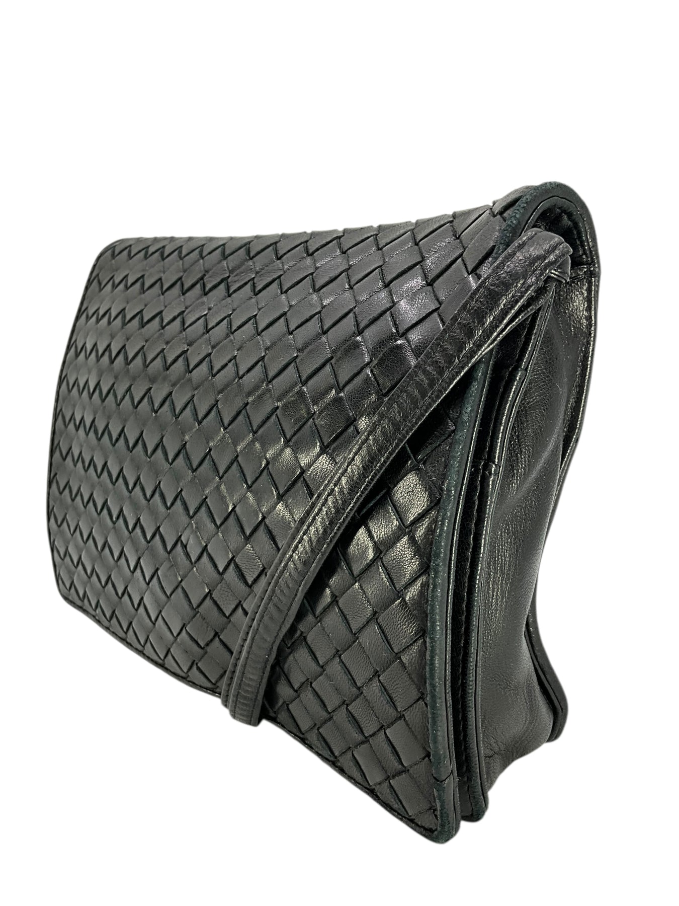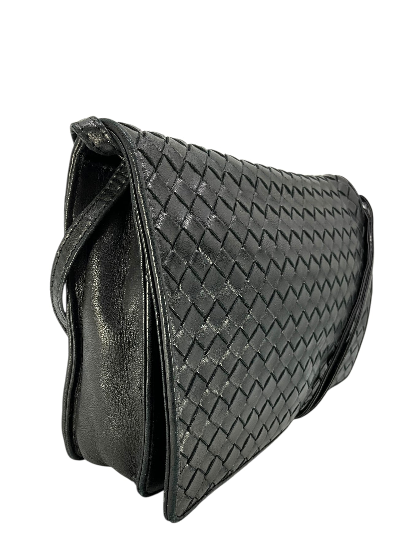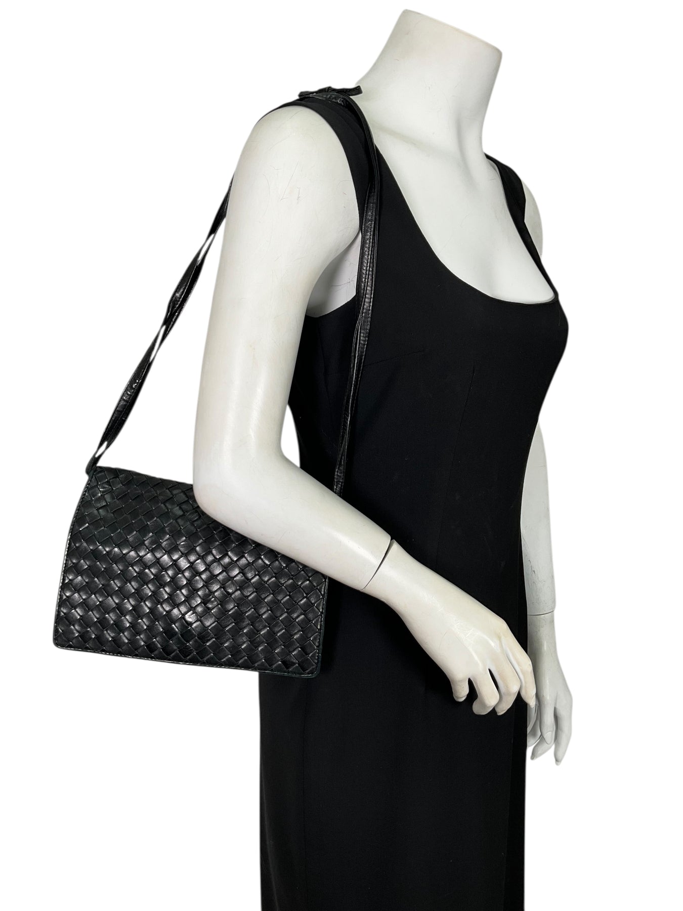 This authentic Bottega Veneta Vintage Intrecciato Crossbody Bag is crafted from iconic black woven leather. It features a long thin shoulder strap that can worn long, doubled or tucked away neatly inside the bag and carried as a clutch. A 3-in-1 bag!