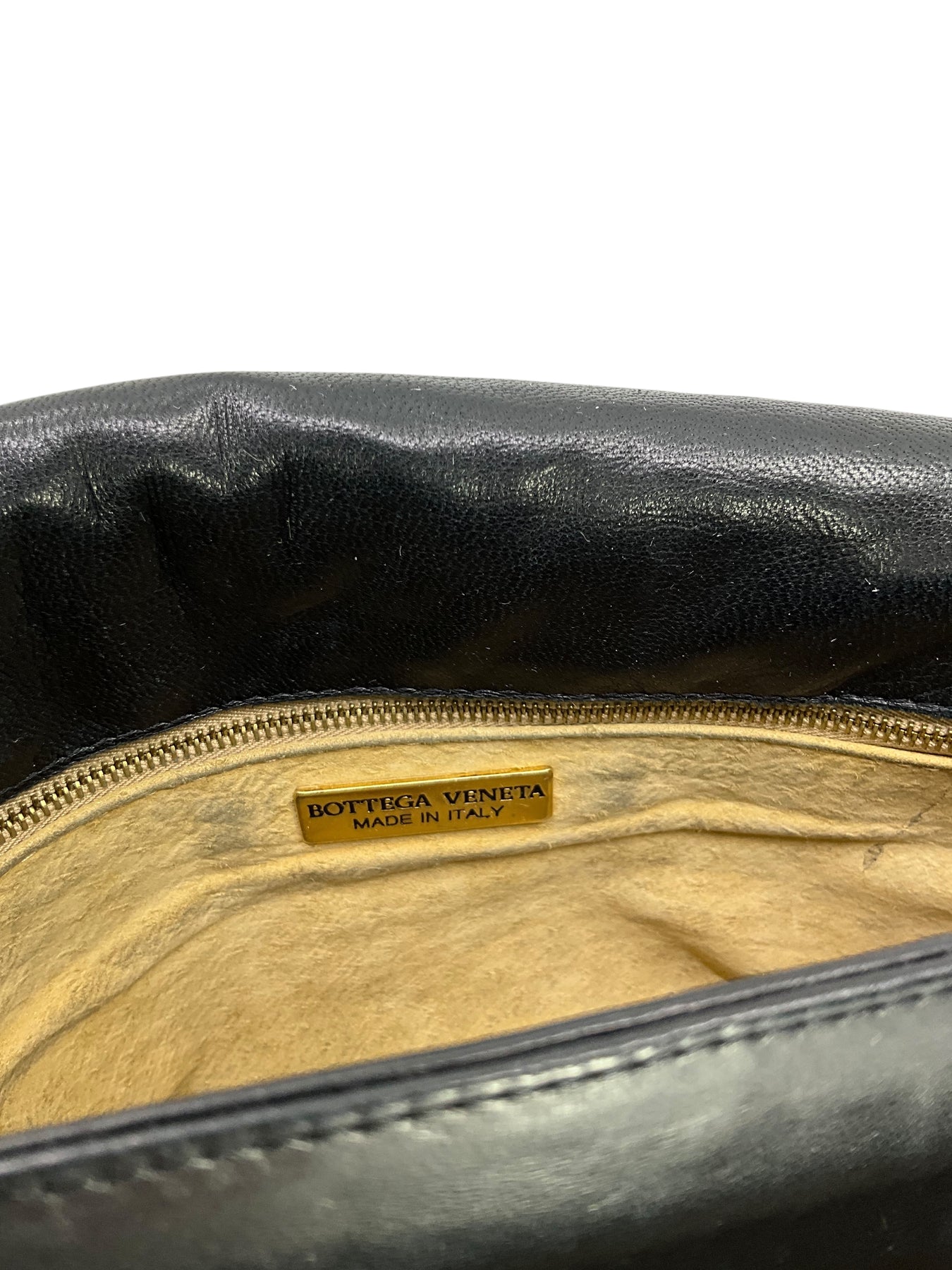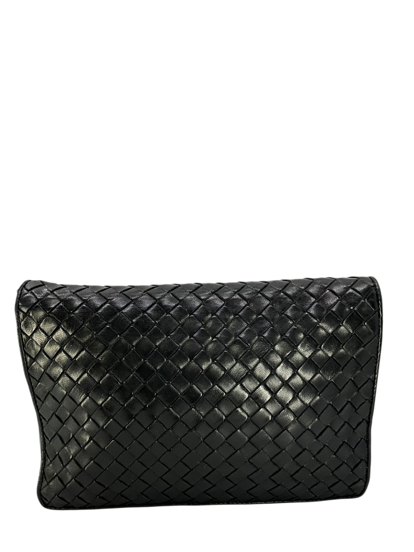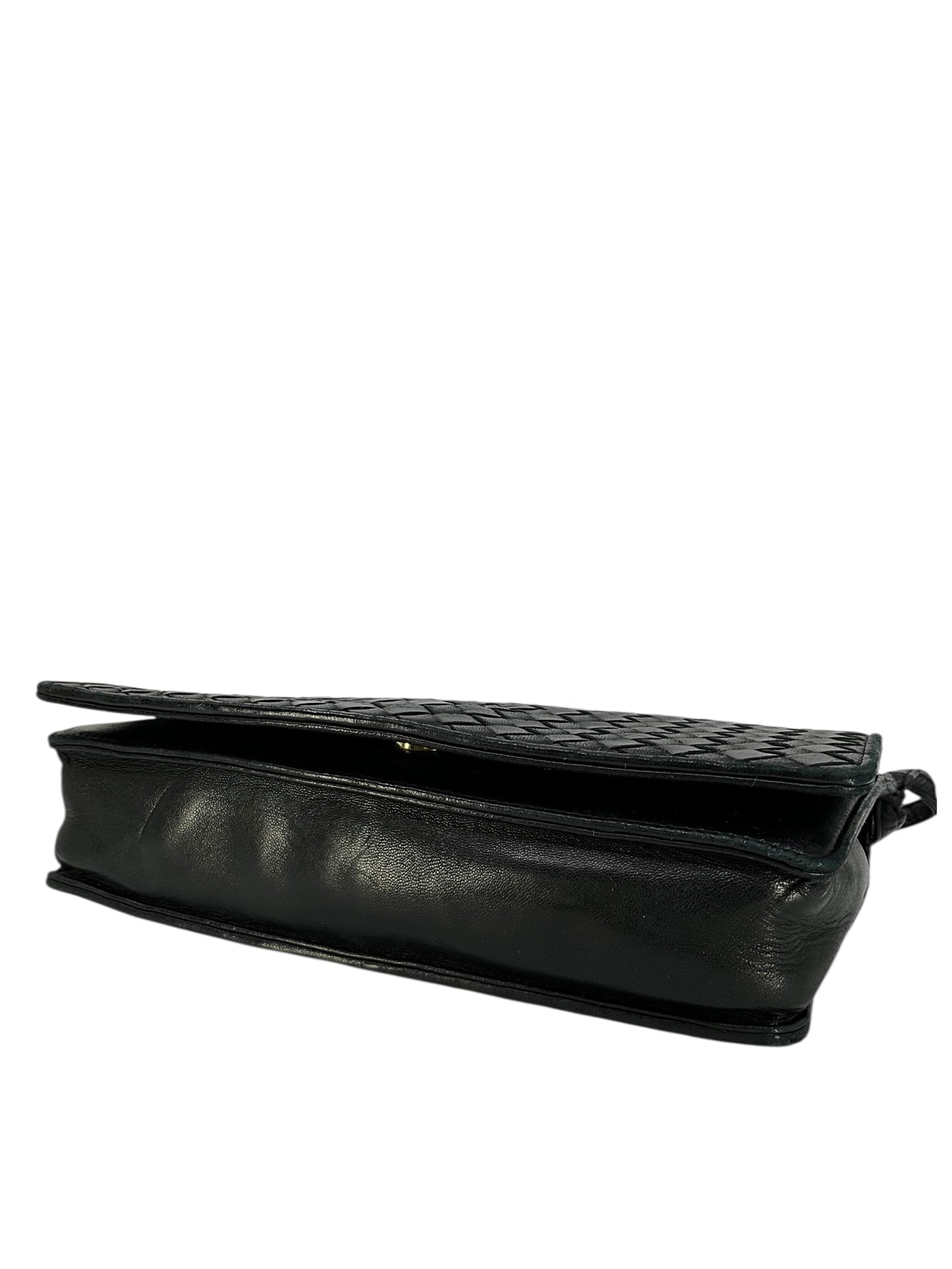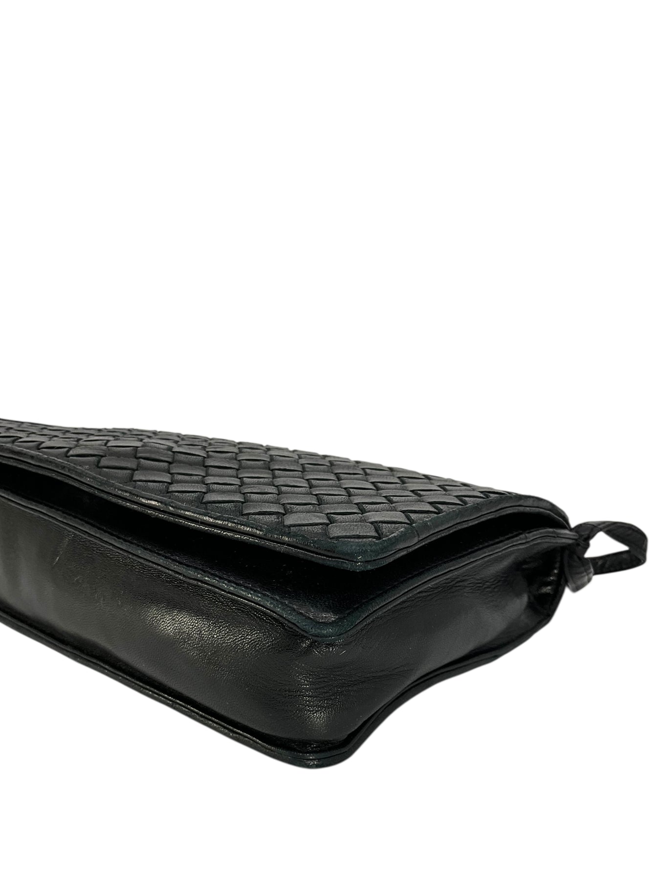 This authentic Bottega Veneta Vintage Intrecciato Crossbody Bag is crafted from iconic black woven leather. It features a long thin shoulder strap that can worn long, doubled or tucked away neatly inside the bag and carried as a clutch. A 3-in-1 bag!