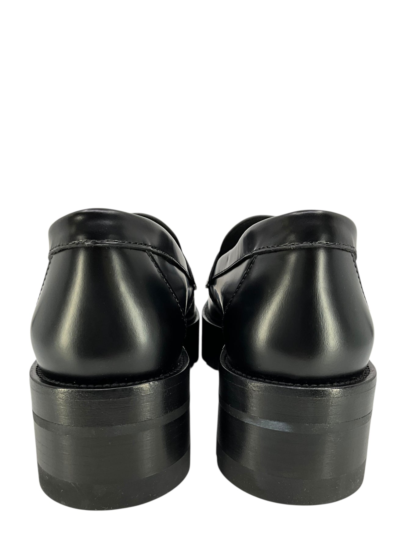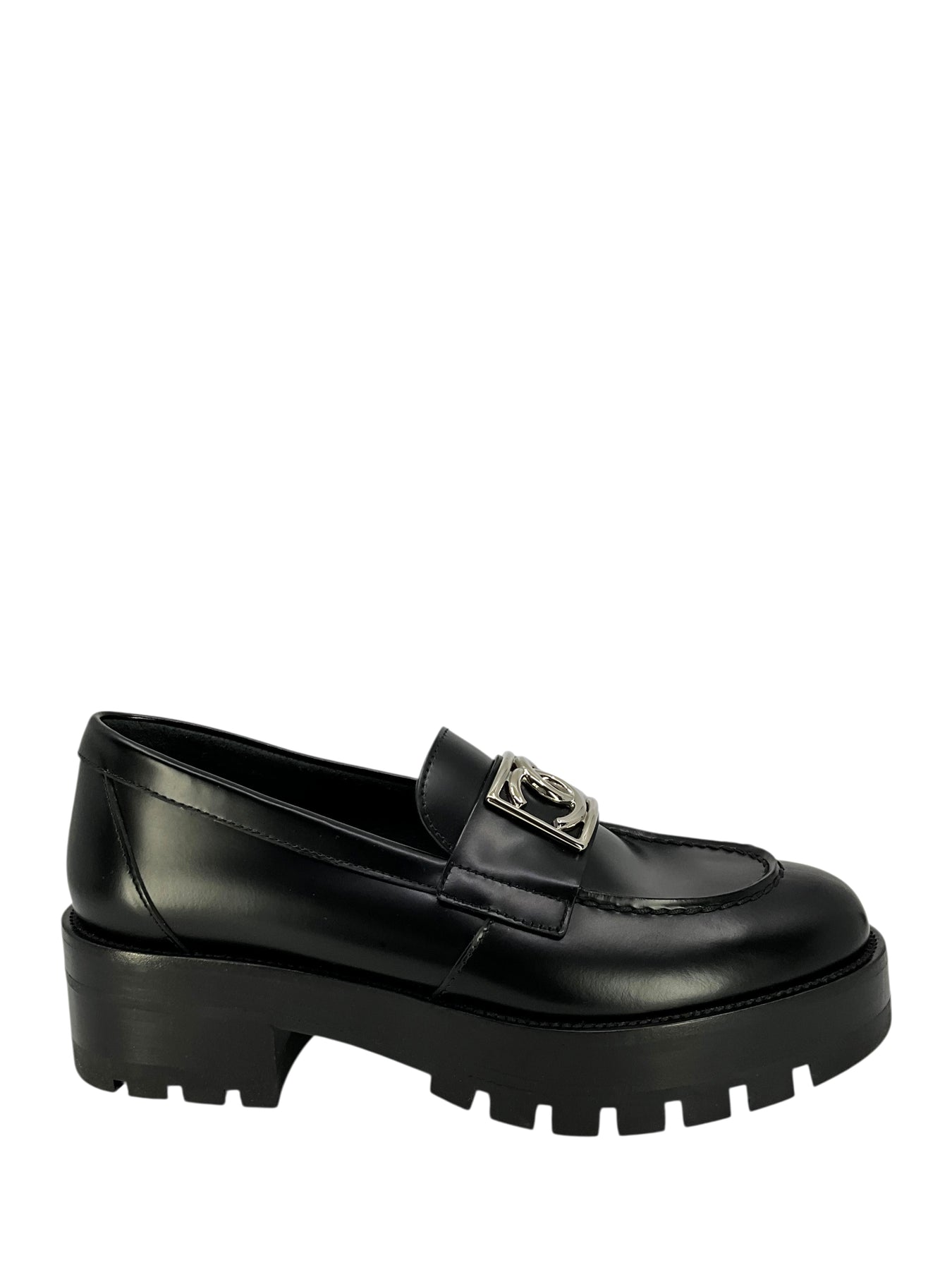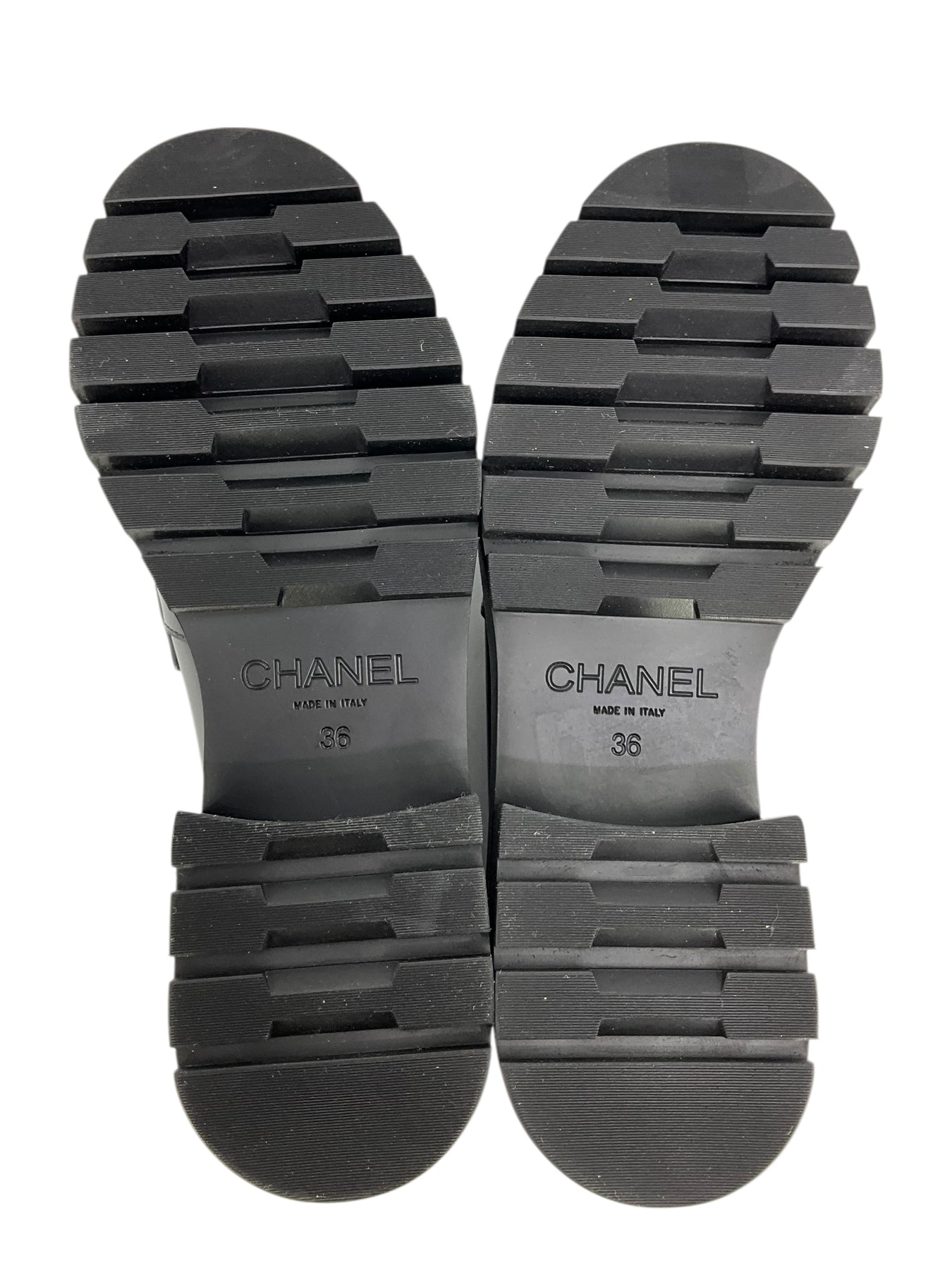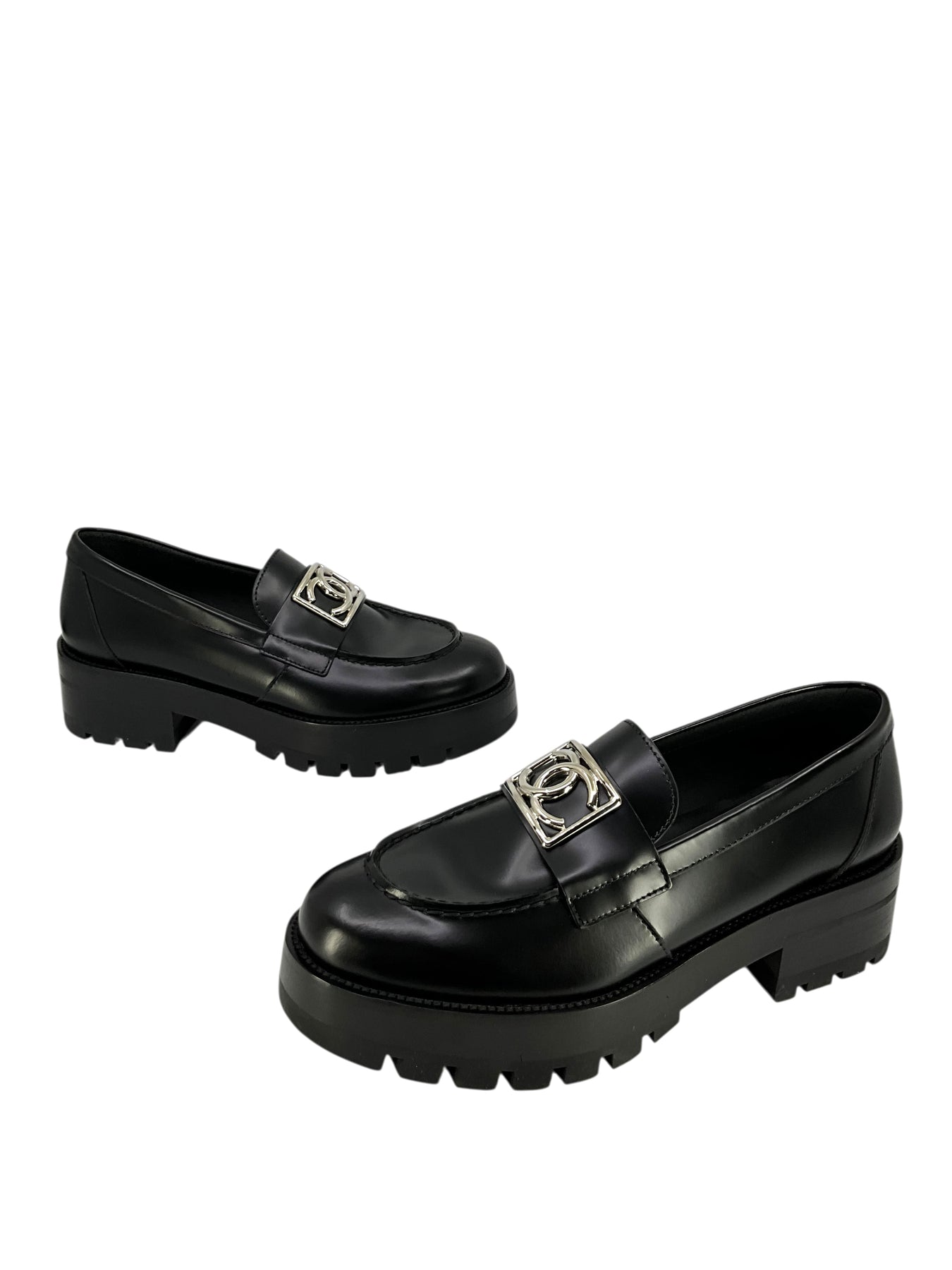 We guarantee the authenticity of these CHANEL 2023 Interlocking CC Logo Loafers Size 6 (IT 36) crafted in Italy from the finest smooth black leather. Featuring a round toe, a chunky block heel and a signature silver-tone CC logo accent.
