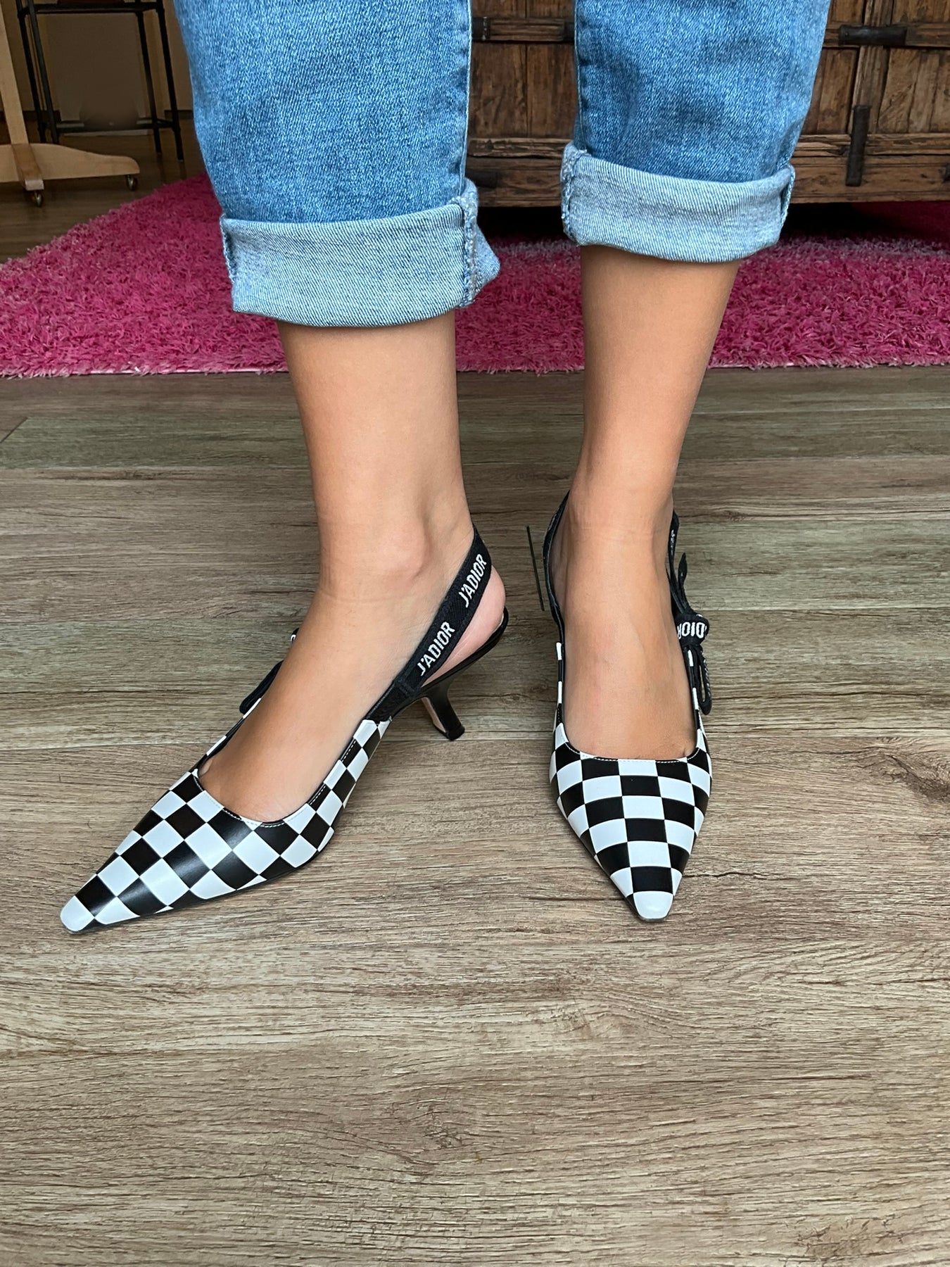 We guarantee authenticity of these CHRISTIAN DIOR J'Adior Checkered Slingback Pumps Size 7.5 crafted from an elegant black and white check printed leather with a fine-pointed toe. Featuring a logo-printed ribbon accent