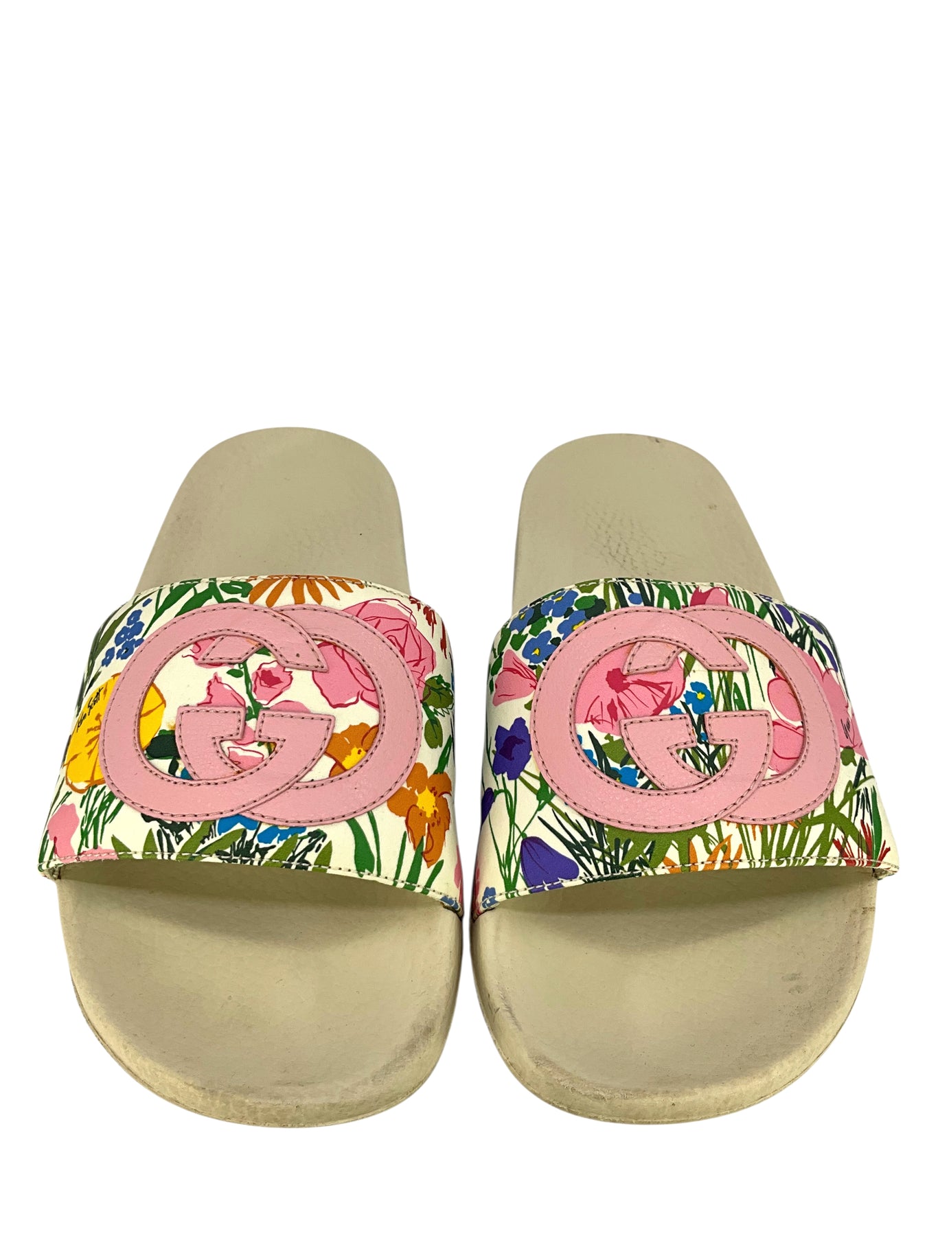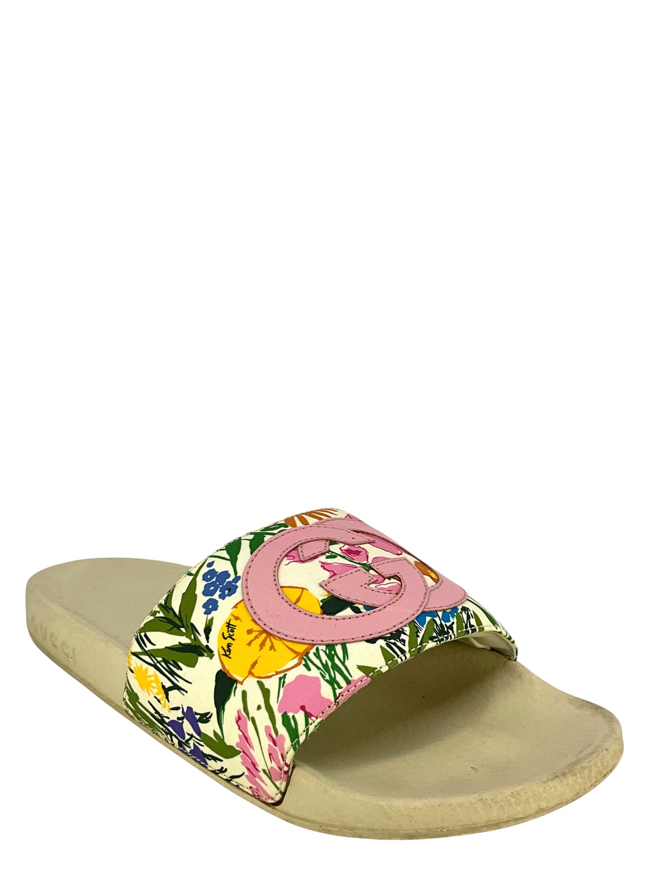 We guarantee the authenticity of these current Gucci Pursuit Floral Print Slide Sandals Size 7 a collaboration with botanical print from designer Ken Scott.