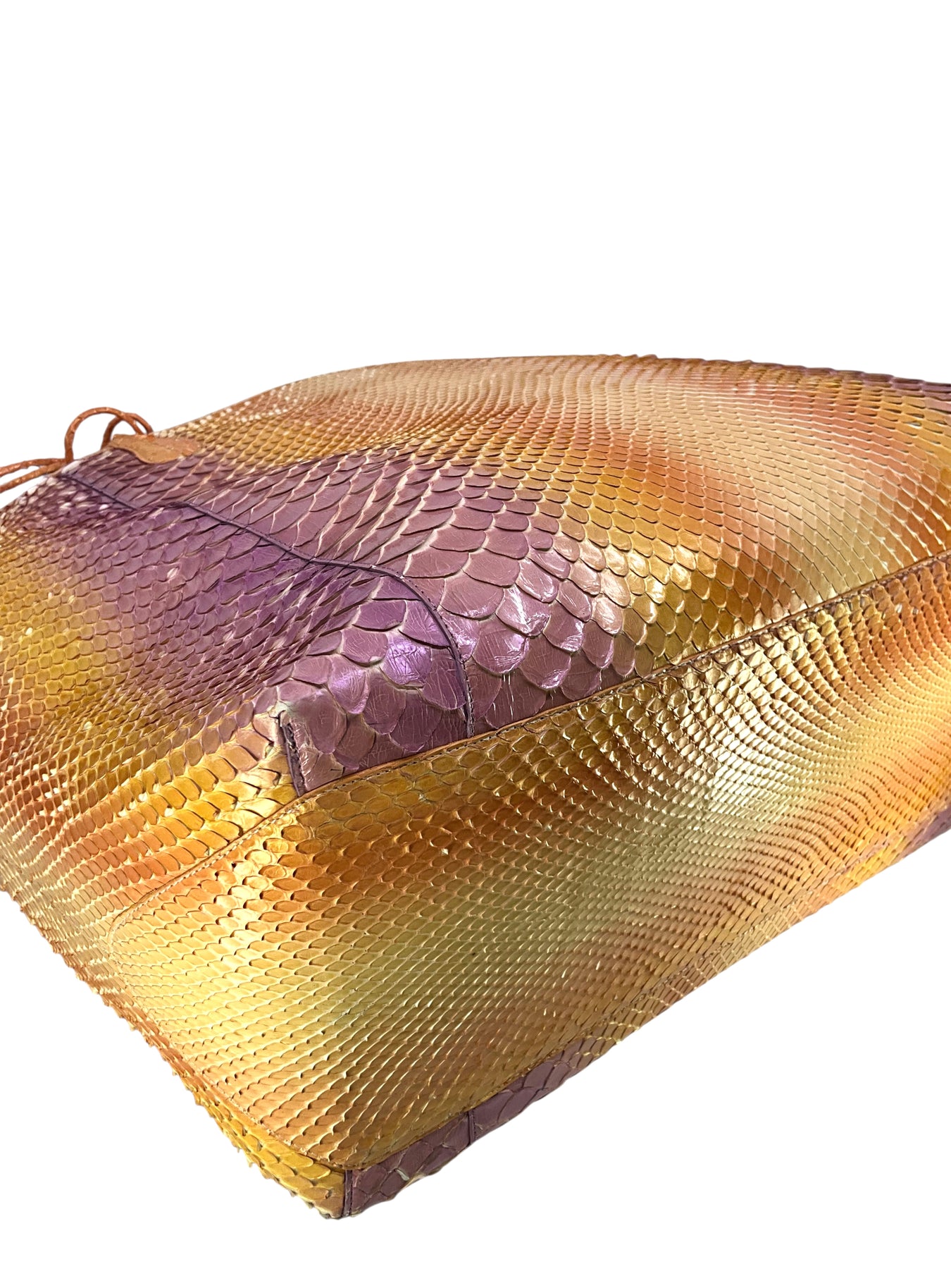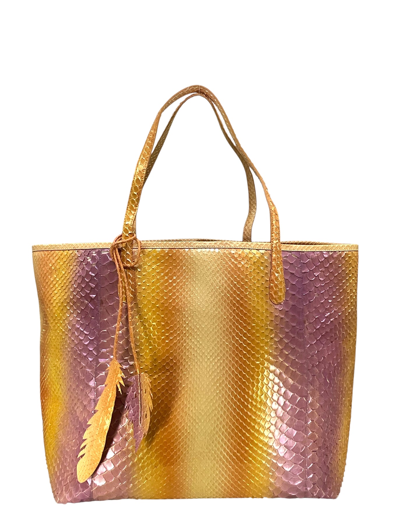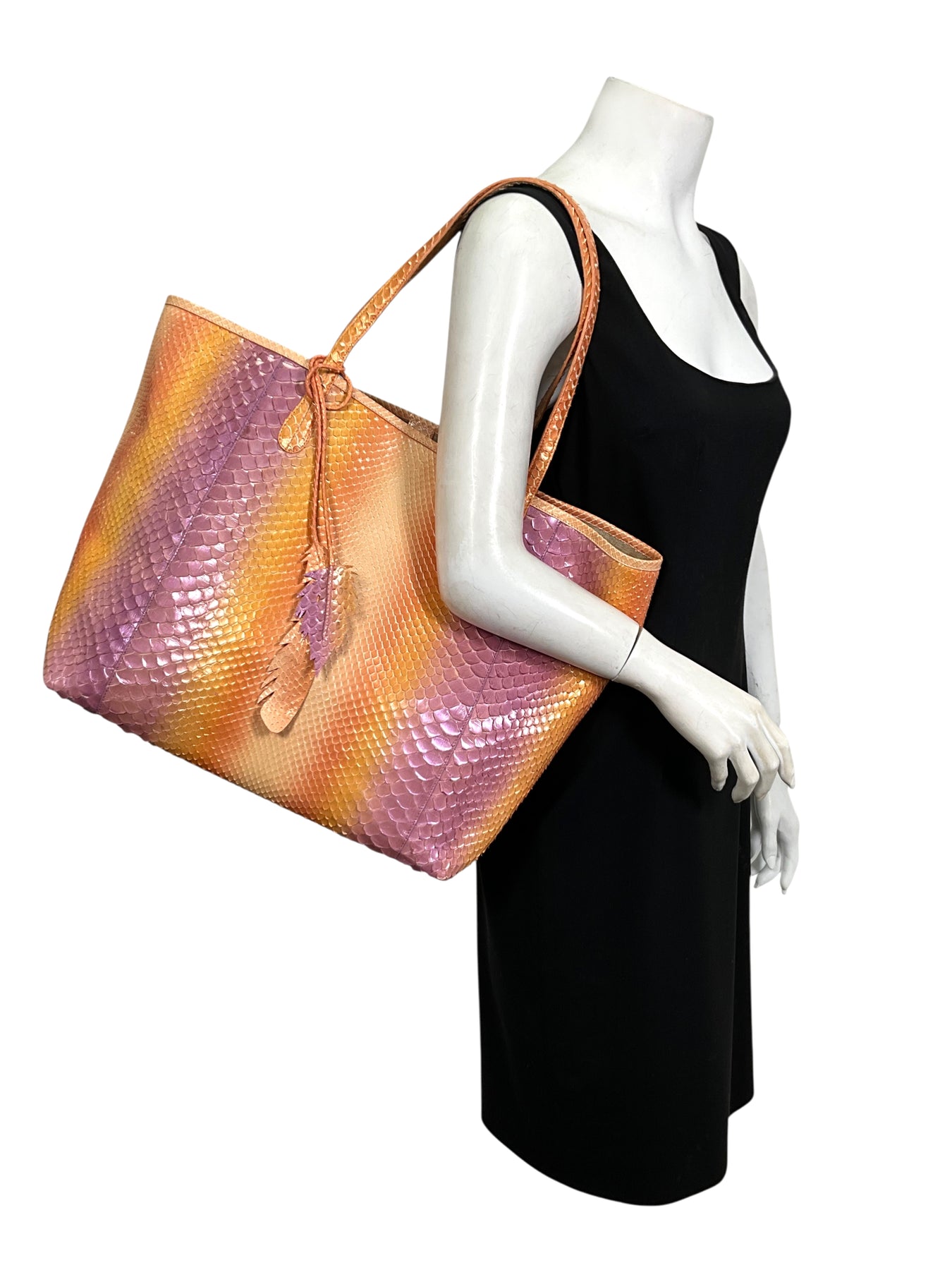 We guarantee the authenticity of this never before used beautiful NANCY GONZALEZ Large Erika Python Tote NEW crafted in beautiful orange and pink ombre. Featuring dual flat top handles and hanging leaf and feather charm. The interior is finely lined in smooth beige suede with zip and patch pockets.