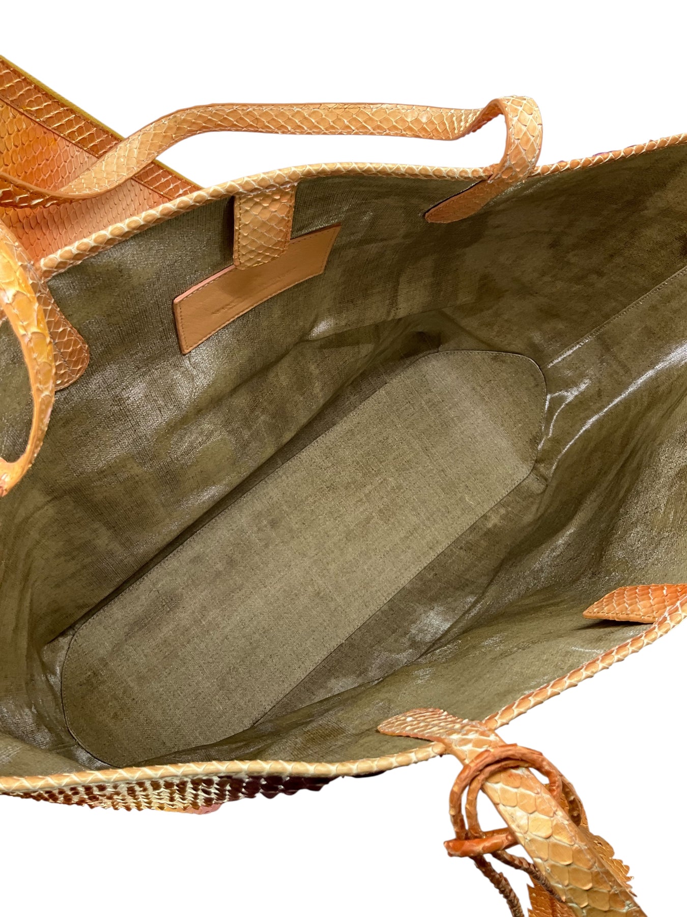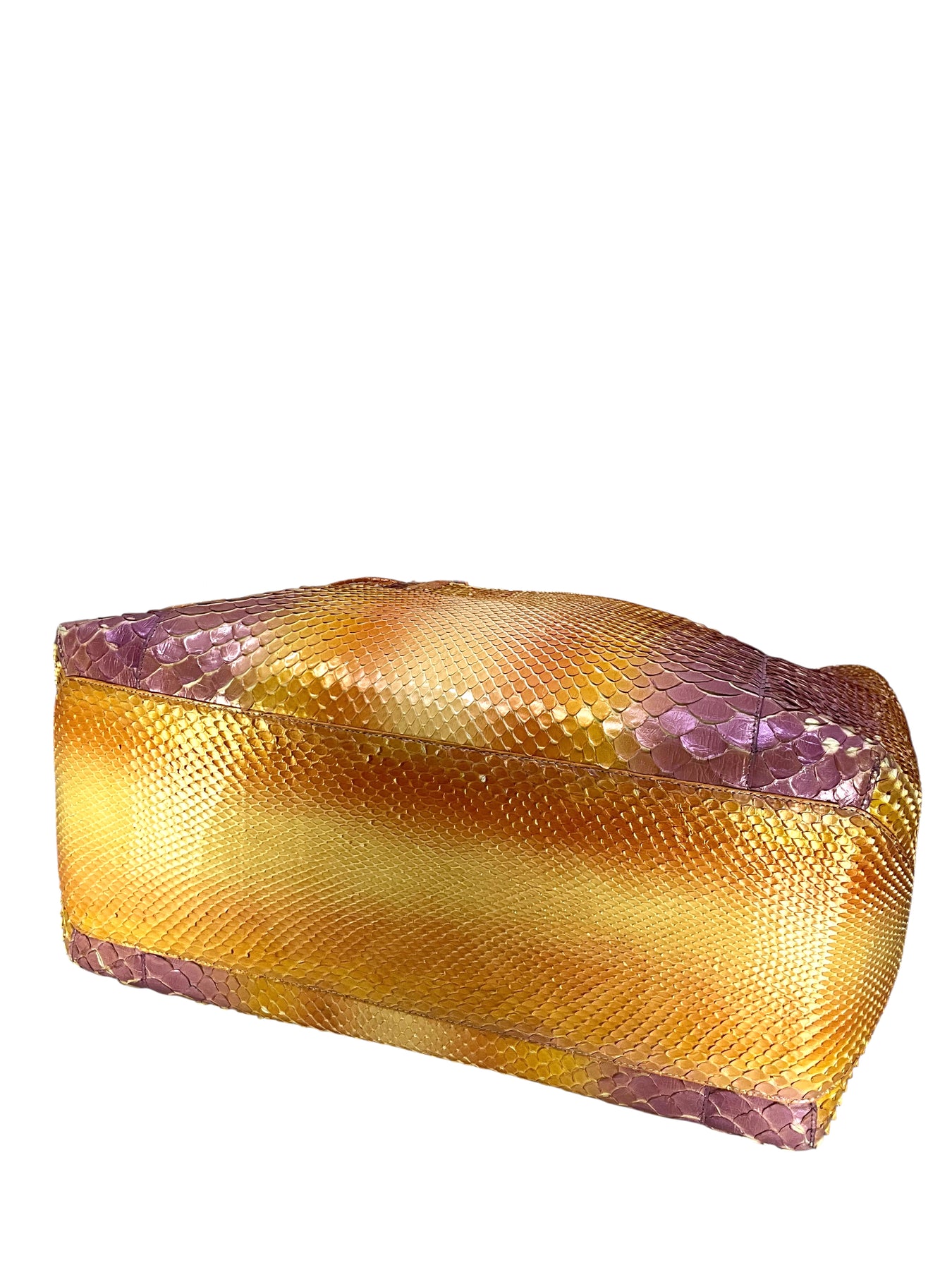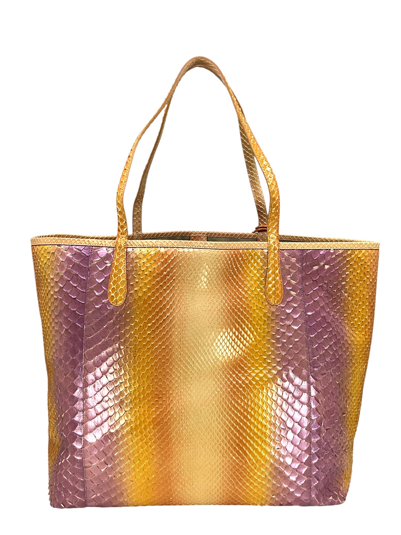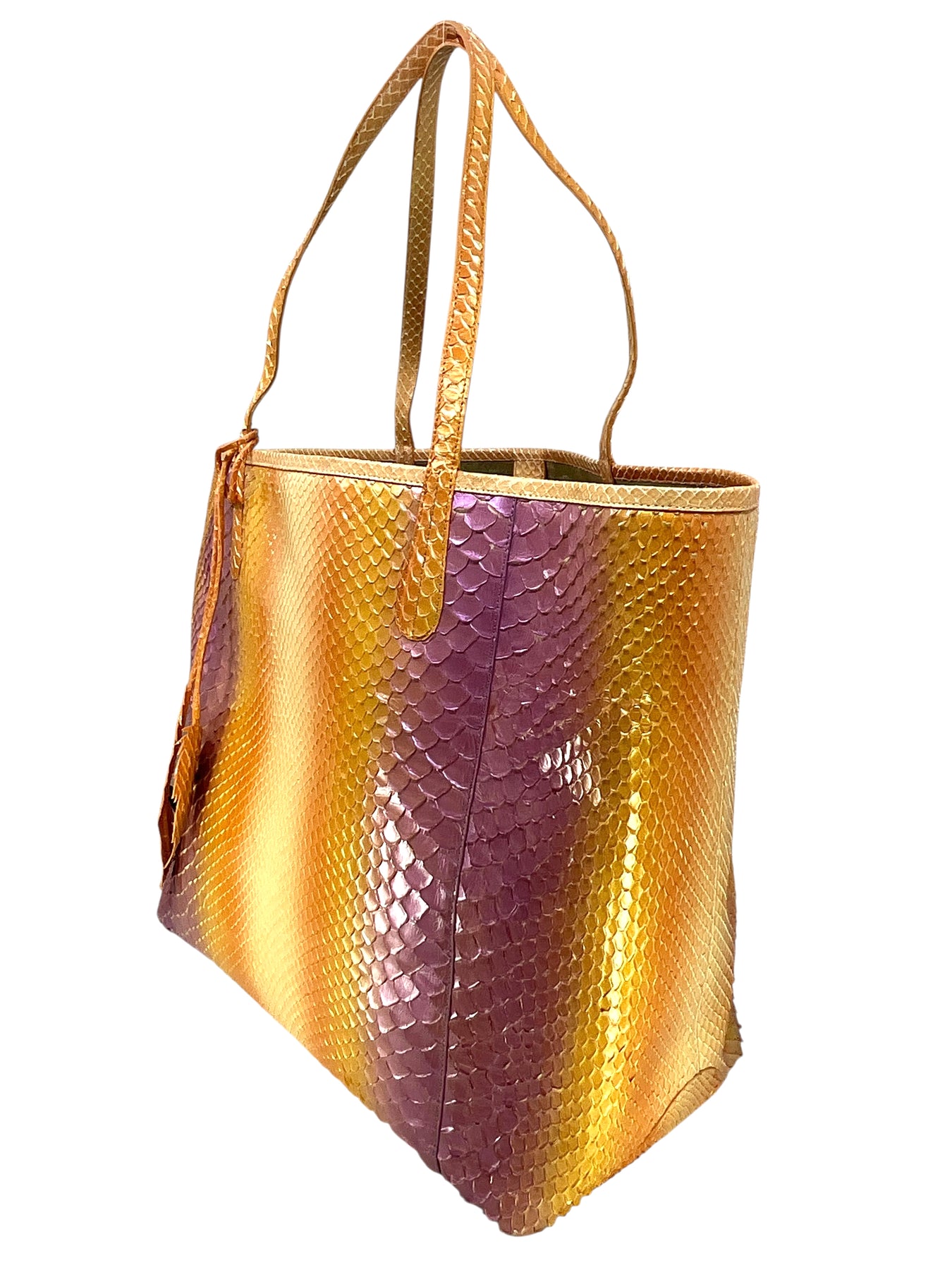 We guarantee the authenticity of this never before used beautiful NANCY GONZALEZ Large Erika Python Tote NEW crafted in beautiful orange and pink ombre. Featuring dual flat top handles and hanging leaf and feather charm. The interior is finely lined in smooth beige suede with zip and patch pockets.