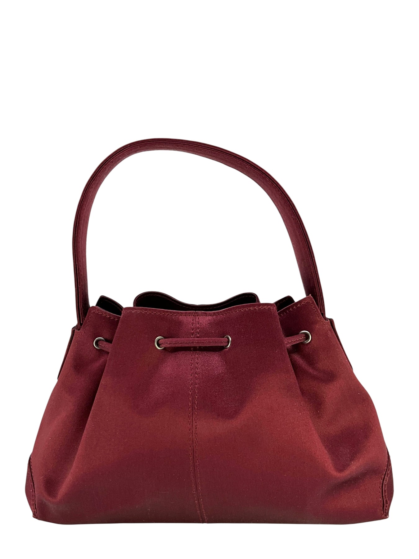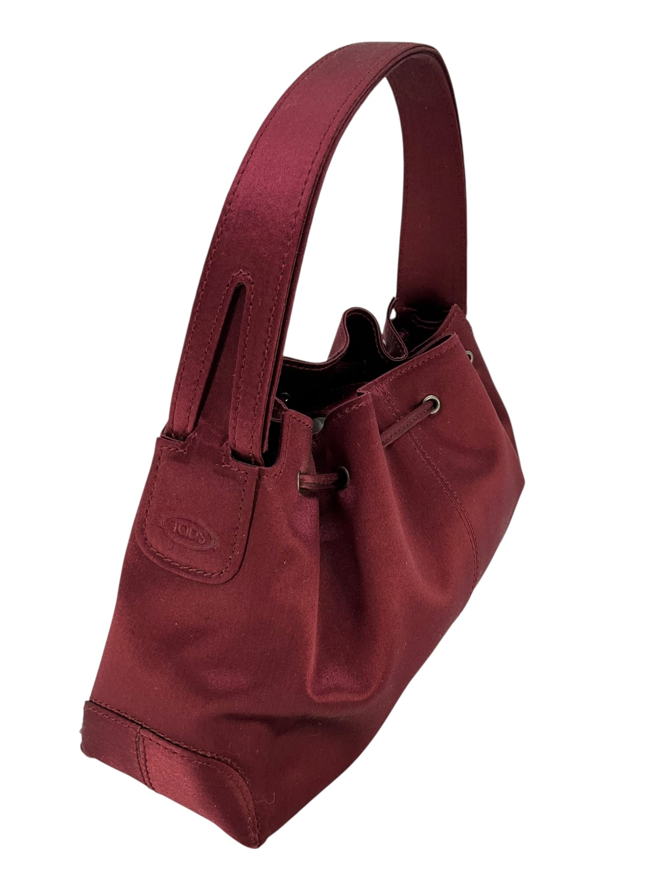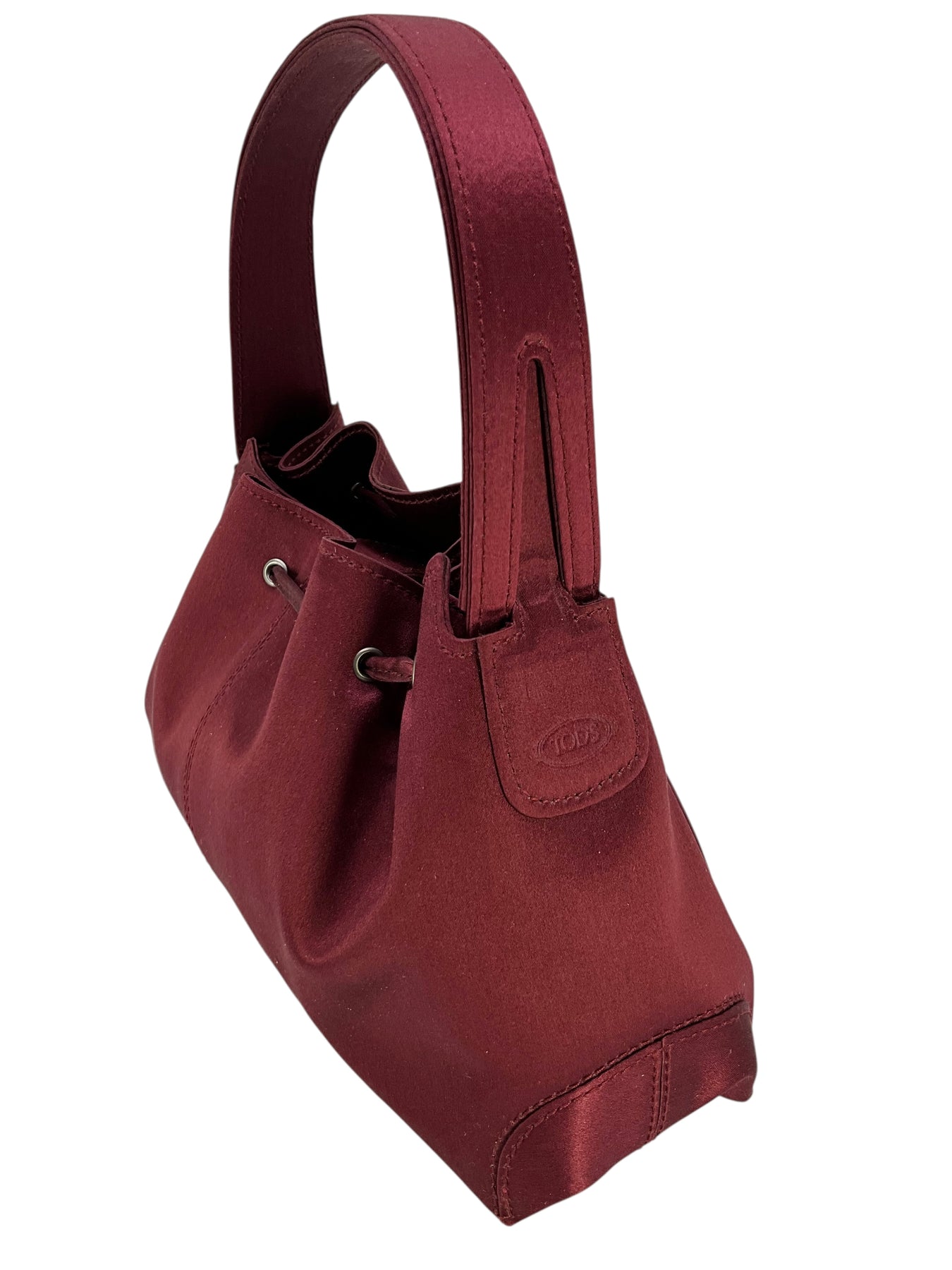 We guarantee the authenticity of this Tod's Satin Drawstring Top Handle Mini Evening Bag crafted in soft burgundy satin with a single top handle and drawstring accent.