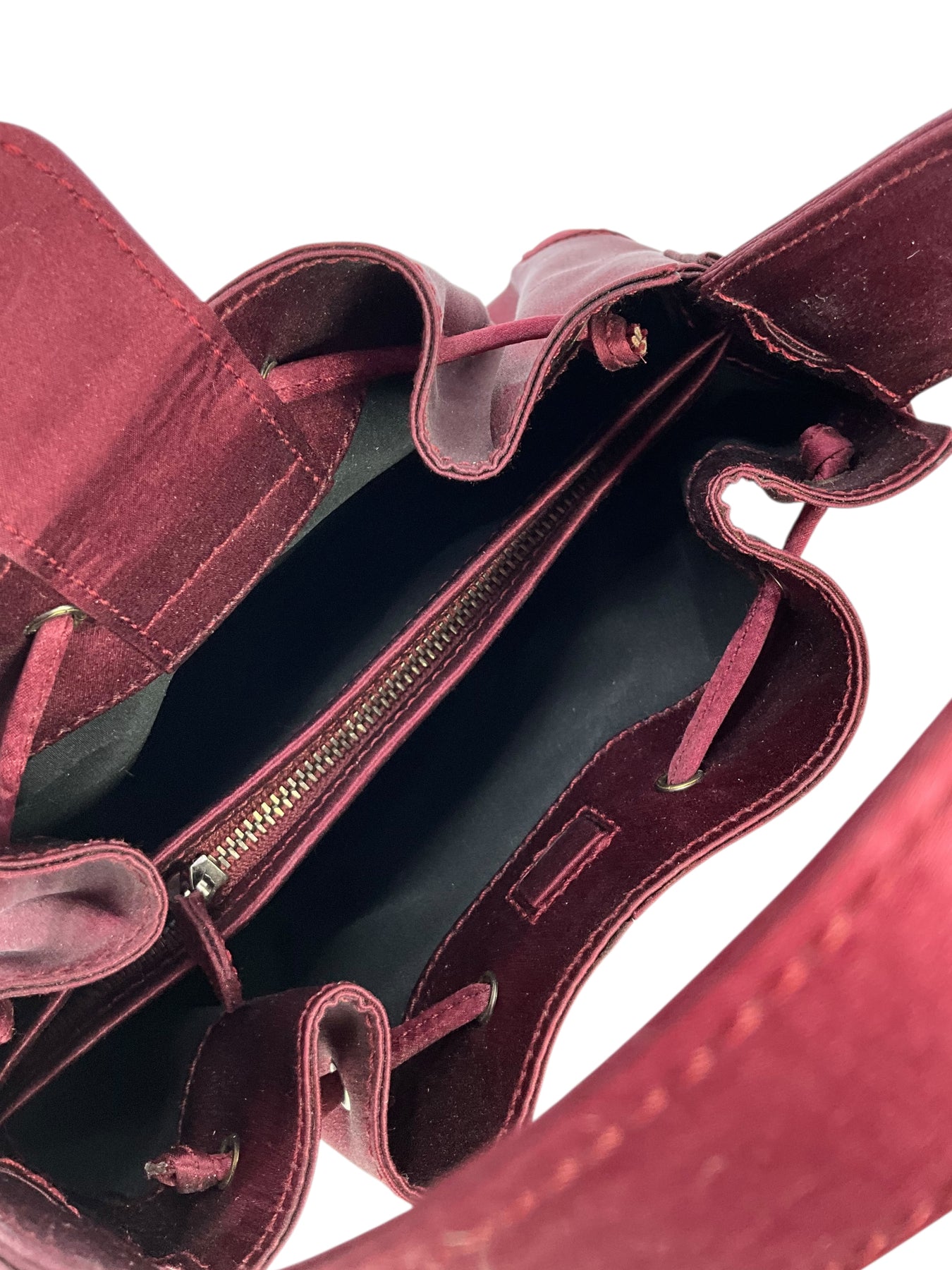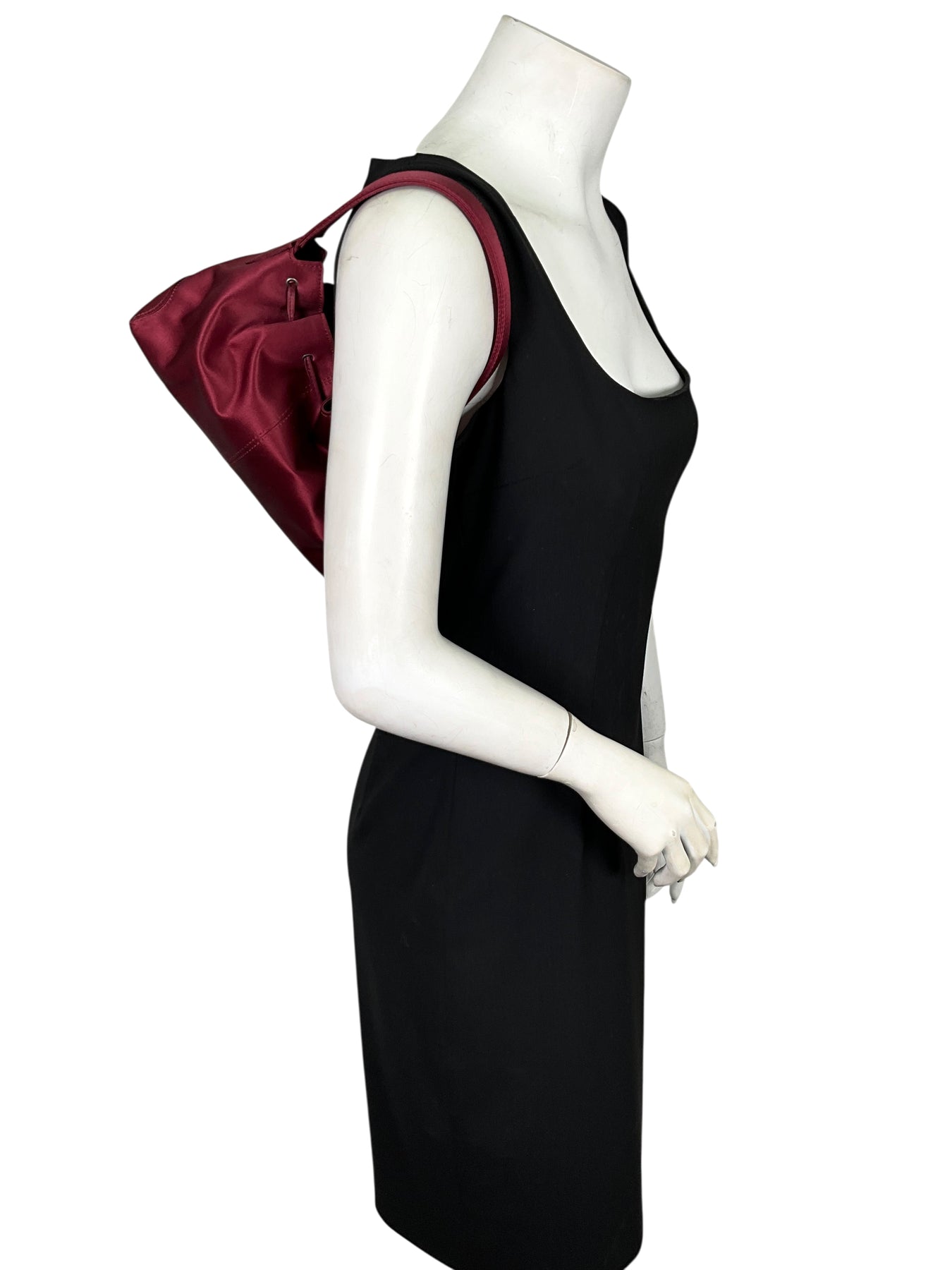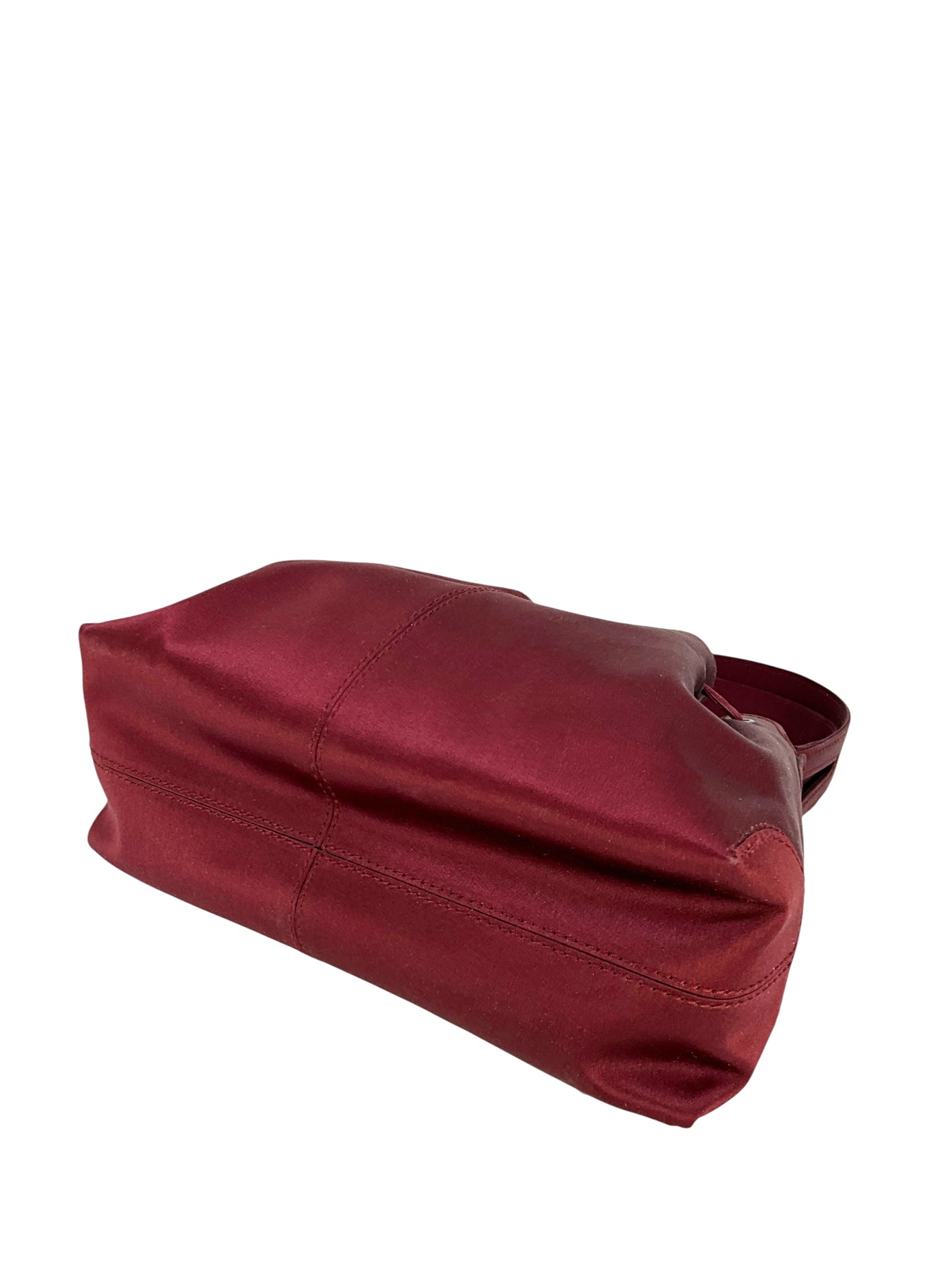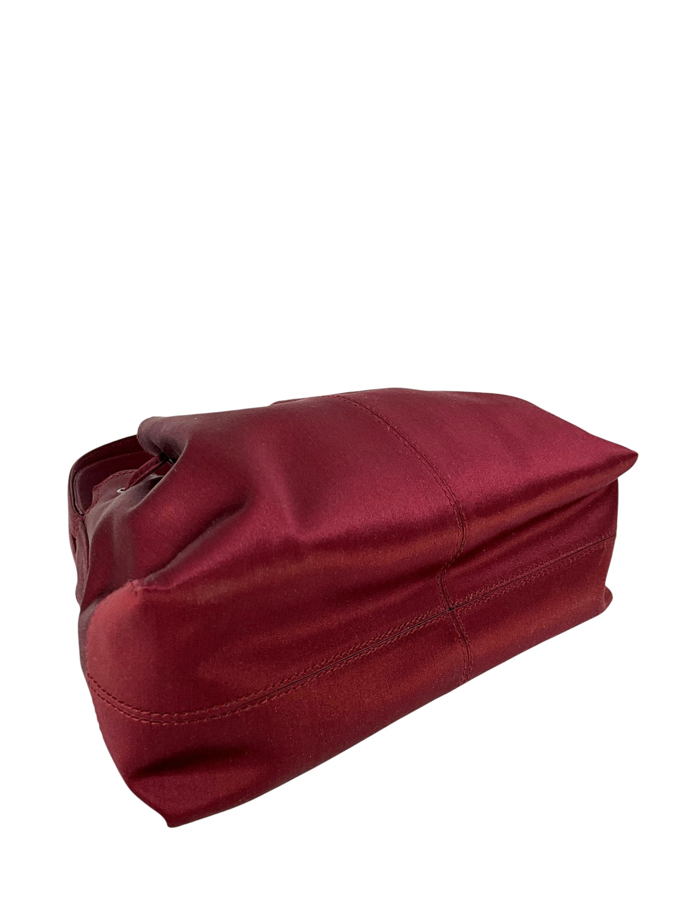 We guarantee the authenticity of this Tod's Satin Drawstring Top Handle Mini Evening Bag crafted in soft burgundy satin with a single top handle and drawstring accent.