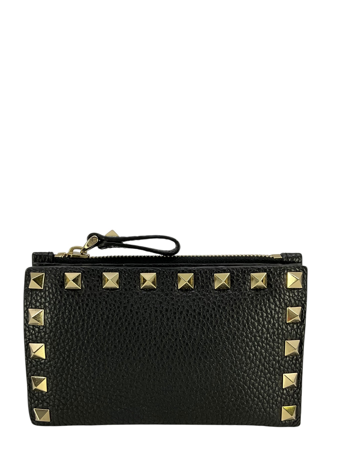 Carry your essentials in style with this Valentino Garavani Rockstud Leather Card Holder Coin Purse in black pebbled leather and light gold-tone hardware. Featuring signature pyramid stud detail, a top zip coin pouch and a snap closure that opens to eight interior credit card slots.